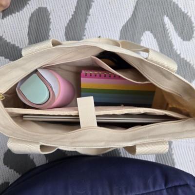 I love everything about the bag except the canvas fabric. Unfortunately it attracts hair and fuzz. Since I have a white dog it's always going to look dirty if I use it so it's not going to work for a work tote. But my 15" Dell laptop fits perfectly in the sleeve and I could fit my makeup bag and a metal water bottle easily. Sadly I will be returning it because I don't want to show up to the office with a hairy bag. It's really nice quality though and I would recommend it if you don't have issues with hair sticking to it.