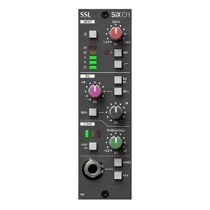 The Solid State Logic SiX Channel 500 Series Channel Strip is a single-width 500 Series channel strip using the SuperAnalogue channel processing features from SSL’s SiX console including the Mic-pre, low and high-frequency EQ, as well as the single knob compressor.SuperAnalogueUsing the same technology as SiX and large-format SSL consoles, SiX CH features a SuperAnalogue mic pre, offering wide gain range and ultra-low noise. It’s clean, fast, and punchy - the perfect preamplifier for any source material.SSL HF and LF EQSiX CH EQ is a classic SSL style gentle, broad stroke two-band design with high and low shelving filters at 3.5 kHz and 60 Hz, plus-minus 15 dB gain range. Each band can be independently switched between shelving and bell curves. The bell curves change centre frequency to operate at 5 kHz and 200 Hz giving greater versatility from the two controls.Channel CompressorA ‘one knob’ channel compressor with features that give powerful and versatile performance from its deceptively simple controls. It uses the tried and tested SSL feed-forward circuit design, program-dependant attack time, and automatic make-up gain to maintain signal level.TRS Line InputThe front-facing TRS line input offers a convenient way to add instruments on the fly or use SiX CH as a feature-packed summing module. 10 k ohm nominal Line Input impedance can be changed to 1 M ohm via the Hi-Z switch. The 1M ohm impedance makes this input suitable for very high impedance sources such as passive guitar pickups without needing an external DI box..