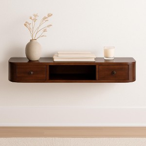 This wall-mounted console is crafted from 100% solid mango wood in a chestnut finish, featuring a unique rounded edge design. Its leg-free design allows for easy wall installation while maintaining elegance and functionality.