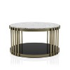 Enveloped in an alluring antique brass-plated steel frame, this exquisite coffee table elegantly showcases a sumptuous faux white marble tabletop, accented by a striking black tempered glass base. The harmonious interplay of these contrasting yet complementary materials captures the essence of sophisticated elegance, elevating the aesthetic of any living space. Far more than a mere visual feast, this table also offers unparalleled functionality. Utilize its chic black glass base as an additional shelf space—perfect for elegantly displaying cherished books, artisanal decor, or mementos—infusing a touch of finesse and practicality to your sitting room or lounge area.