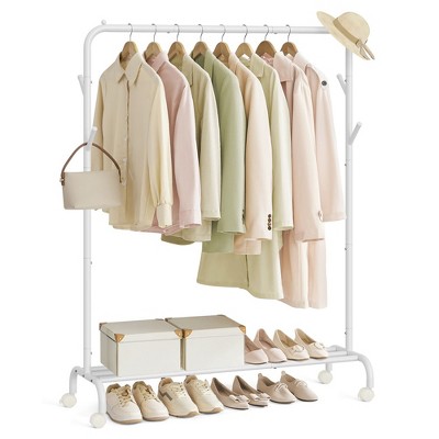 - 【VERSATILE STORAGE】With a high rail for hanging clothes of different lengths, hooks on both sides for bags and hats, and a bottom shelf for boxes and shoes, this clothes rack keeps all your essentials in one place