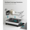 Optimized Design: This 2-tier dish drying rack features a top shelf for plates and a bottom shelf for bowls, ensuring optimized space for efficient dish organization. The 360¡ã rotatable and extendable drain spout ensures water flows directly into the sink, keeping your counter dry and clean. No more messy kitchen spaces! Versatile Convenience: This dish drying rack includes a 2-tier cup holder with a drip tray, a utensil holder, and a cutting board holder, providing easy organization for all your kitchen essentials. Made from fingerprint-resistant stainless steel, this dish drainer is both functional and stylish. Keep your kitchen clean and organized with this compact and convenient dish drying rack.
