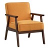 Cozy up in your favorite chair to watch movies, read your favorite books or simply relax with the Sonia chair from Buylateral. Featuring yellow fabric upholstery, this set's mid-century modern design complements vintage and classic furnishings. The durable rubberwood frame in a walnut finish is pleasingly ideal for everyday use and coordinates well with many room interiors. Overall chair dimensions 30.5 inches high x 24.3 inches wide x 31.3 inches deep.