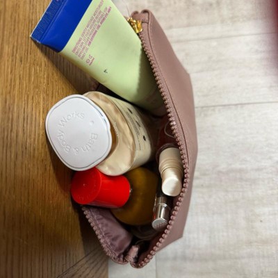 [This review was collected as part of a promotion.] The textured finish on the small makeup bag looks good but I don't enjoy the feel of it when I hold it. Maybe because it's made out of polyester? I get sweaty hands holding it. It can hold a basic skincare routine and some of my makeup. The zipper works alright and the stitching looks clean and tidy.