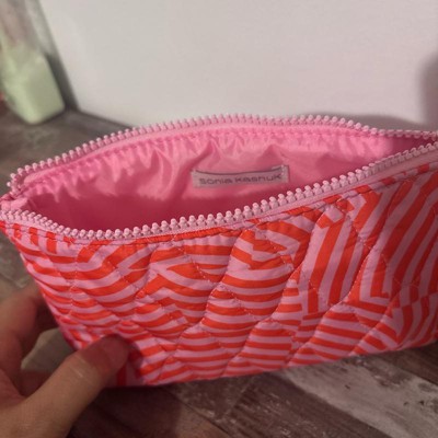 [This review was collected as part of a promotion.] Got this cute pink/red swirl color makeup bag from Sonia Kashuk .This bag design is good and size is perfect for travel .This makeup bag can fit all basic makeup items needed for travel.The material is made with 100percent polyester with quilted design which makes it preety makeup bag.The zipper closure secure all the materials inside.