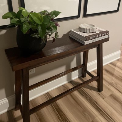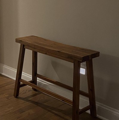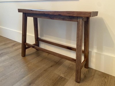 This bench was just perfect for the spot we needed it for- a small sized space in our entry. It's a great spot that you can sit on and put on your shoes, or just put your shoes under and place things on top while you hang your coat. The quality of the wood is beautiful and it is very durable. My husband and I are larger people, and this bench is sturdy enough for us to feel safe. The only complaint I have is that it is only 9" deep, so if you have a larger than average "bum" it's not the most comfortable to sit on for more than a few minutes. At least it isn't bulky and hanging over into the area we need to walk through. It can be used elsewhere in a pinch if you need counter height seating (it is 24"high) or it can be a cute little display table as well. Versatile and sturdy. Win!