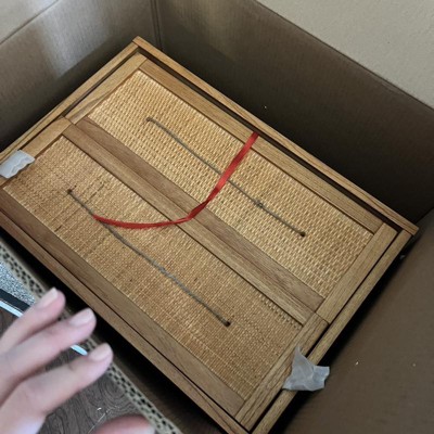 - Woven rattan panels give the nightstand a striking, mixed-material appeal