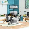 DESIGN SPECIFICATIONS - Charming design made of carbon steel with classic black finish - Wipes clean with damp cloth - Utensils, napkins, and dishes NOT INCLUDED - Holds square napkins 7" x 7" or smaller - Middle tier holds 8" plates - Bottom tier holds 10.75" plates - Utensil Holders 5"D - Entire Unit Measures Approximately 18.50" L x 10" W x 21.75" H (Stacked)