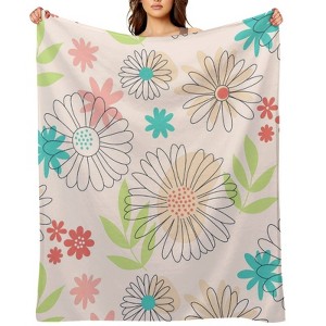 Soscooter Flannel Blanket Light Beige Base Large Daisy Floral Pink Green Pattern Soft Cozy Throw Blanket for Couch Bedroom 50x60 inches