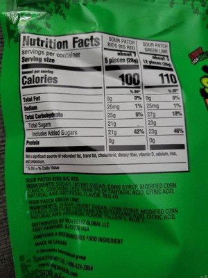 sour patch kids big red: sugar, invert sugar, corn syrup, modified corn starch, contains less than 2% of tartaric acid, citric acid, natural and artificial flavor, red 40. sour patch green lime: sugar, invert sugar, corn syrup, modified corn starch, contains less than 2% of tartaric acid, citric acid, natural and artificial flavor, yellow 5, blue 1.