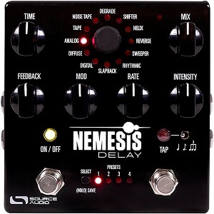 Nemesis offers 26 distinct effect engines ranging from vintage tape and analog delays to highly advanced pitch-shifting, reverse, filter modulating, and rhythmic delays. It also features 128 presets, multiple delay taps, a hold function, tap tempo, full MIDI control, deep editing functionality with the Neuro Mobile App and much more.The Nemesis Delay captures the full spectrum of delay effects, starting with a comprehensive collection of meticulously crafted vintage delay tones. The Source Audio engineering team spent over a year studying numerous iconic and sought after tape and bucket brigade delay units with a staunch dedication to identifying their every nuance and idiosyncrasy. The Nemesis’s Tape, Noise Tape and Slapback delays capture all the characteristic flutter, warmth, and color that give vintage tape delay machines like the Echoplex and Space Echo their classic charm. The Analog delay engine beautifully achieves the resonant peaks combined with high and low frequency decay that typifies classic bucket brigade delay pedals. The pedal’s Digital delay manufactures pristine, high definition repeats with or without filtering effects for a classic rack-system tone.At the opposite side of the spectrum, ’ll find an advanced collection of sophisticated and specialized delay effects. The Shifter delay generates perfect polyphonic pitch intervals with repeats jumping to either an octave (up or down), major or minor third, 4th, or 5th. Sweeper applies modulating filter effects to repeats for a unique delay/wah hybrid tone. Backwards effects like Helix and Reverse provide a perfect blend of chaos and control with multi-tap reverse patterns and angelic pitch shifting effects. A Rhythmic delay features an engaging and musical collection of non-standard multi-tap delay patterns.
