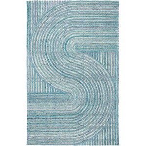 The rugs elegant pattern features undulating stripes in various shades of blue, softly blending to create a serene and dynamic visual experience that mimics the tranquil movement of water. Whether anchoring a living space or adding a splash of color to a bedroom, this rugs modern aesthetic and textural depth cater to a variety of decors and styles.