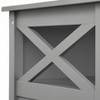 - Feature’s bead-board doors and side panels, 2-door storage cabinet and an adjustable shelf