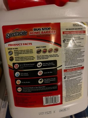 [This review was collected as part of a promotion.] I had lots of palmetto bugs, spiders, mosquitos and a few cockroaches. I was anxious to give Spectracide Bug Stop Home Barrier, Accushot Sprayer, Insect Killer, 1. 33-Gallon a try. I sprayed it around the perimeter of my desk and killed the bugs as desired. There is plenty left over for the perimeter of the yard and the nozzle is easy to use.