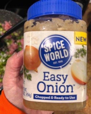 [This review was collected as part of a promotion.] I purchased this Spice World easy onion in a 16 ounce container. This is so convenient to have onions, chopped and ready to use. I just keep this container in my refrigerator and I can easily screw the cover back on in between uses. I added these onions to my cheesy potatoes and I can’t believe the time I saved without having to chop onions for this recipe. I received an incentive to write this review.