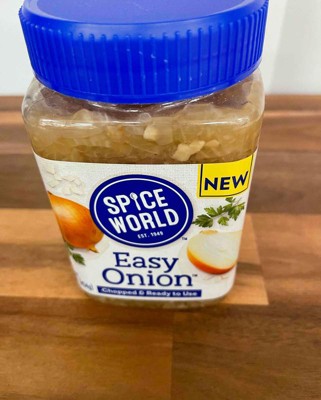 [This review was collected as part of a promotion.] I purchased this Easy Onion, 16 ounce bottle by Spice World. This Easy Onion comes chopped and ready to use. All I had to do was pour it into my pan and it was ready to fry up with some olive oil. I especially liked how small these onions are chopped as I have a few in my family that are not a fan of onion, and I can sneak it in without them even realizing. I received an incentive to write this review.