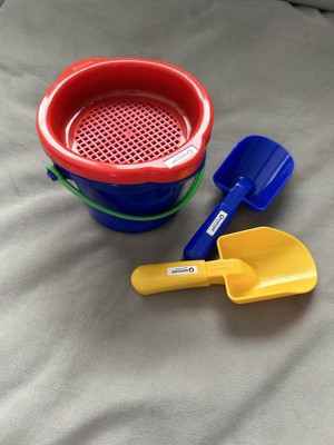 - Please note: Colors vary! 4 piece set will include at least 3 different colors. The pail may ship in red, yellow or green and the sieve and scoops will ship in either red, blue or yellow.