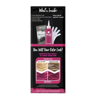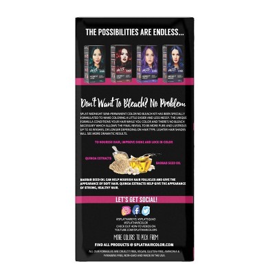 2 kits may be needed for very long or thick hair Splat Product: • Splat is a semi-permanent color that washes out in 4-6 weeks • Results will depend on porosity and condition of your hair • Formula contains conditioners and panthenol to improve moisture retention • Specially developed formula for vivid and dramatic colors even on dark shades • *Strand test: We advise that you test a small section of your hair first to determine results.