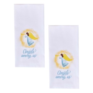 Grace your holiday space with a touch of cozy seasonal spirit using this set of two angelic decorative dishtowels. The printed design features a charming angel with a halo holding a trumpet, accented by the embroidered words, 'Angels among us,' in light blue thread. Complete a Christmas gift or add in your own holiday and everyday kitchen decorations for a fun, festive twist! Crafted from long-lasting cotton material, these spiritual dish towels provide a functional and stylish tool to utilize during everyday kitchen tasks. Simple to display on an oven handle or on a wall hook using the sewn-in tab. Perfect to amplify any winter farmhouse, festive, seasonal, faith, Christmas, holiday decorations, and more.