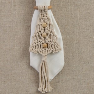 - BOHO MACRAMÉ DESIGN – Cream macramé napkin rings with triangular shape, tassel ends, and wood beads add cozy bohemian charm to your dining décor.