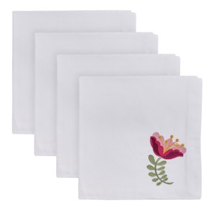 Bright and beautiful, this nature cloth napkin set of four features an intricately stitched flower that will bring a sense of energy and liveliness to any meal setting. The botanical embroidery is adorned in gorgeous fuchsia pink, green, and yellow hues that will make this tabletop linen set great for adding a fresh and casual feel to your home space. Soft and absorbent to the touch, these reusable napkins are constructed of premium cotton material that makes them well-suited to both every day and special occasion meals. Utilize by itself or pair this collection with a decorative napkin ring set of your choice to add extra aesthetic style to a farmhouse, country chic, modern, spring, or contemporary boho tablescape.