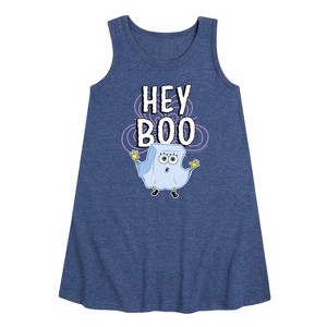 SpongeBob SquarePants - Hey Boo - Toddler and Youth Girls A-line Dress - Dive into the fun of Bikini Bottom with SpongeBob SquarePants graphic apparel! Featuring colorful designs of SpongeBob, Patrick, Squidward, Sandy, and more, this collection brings the show's quirky humor and unforgettable moments to life. Perfect for fans of all ages, these pieces add a splash of personality to any wardrobe.