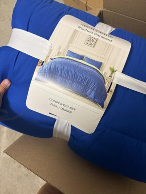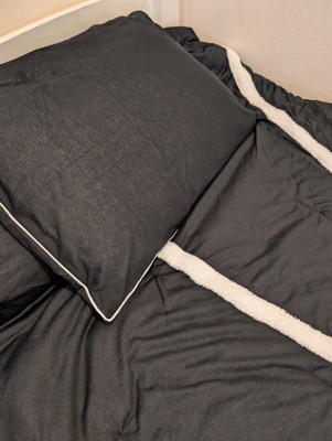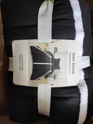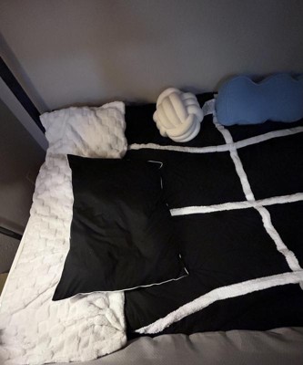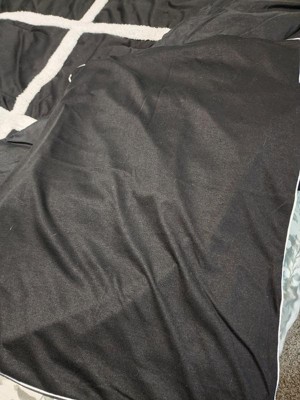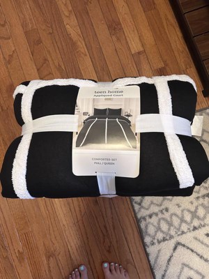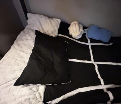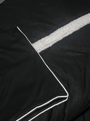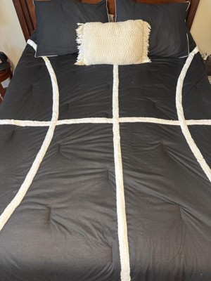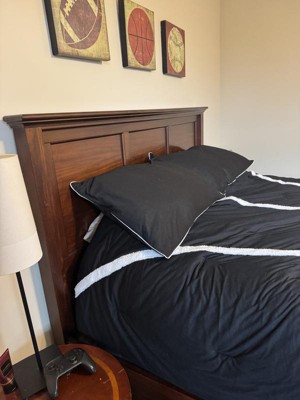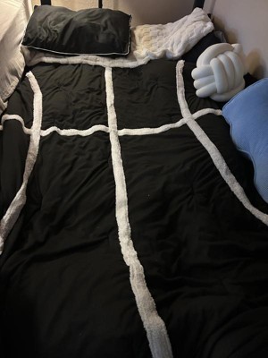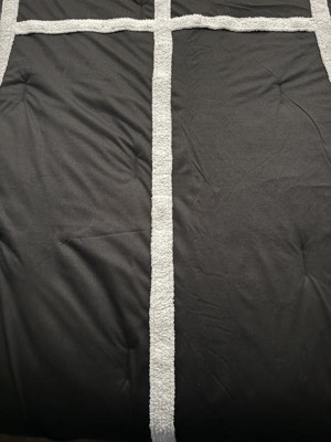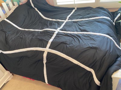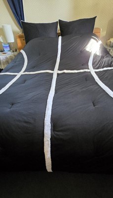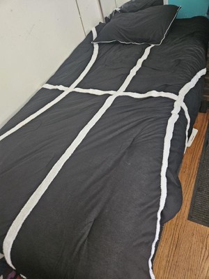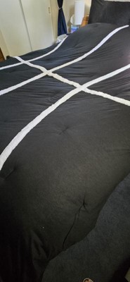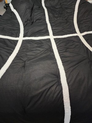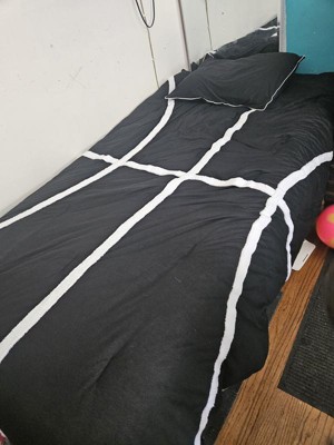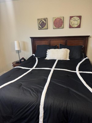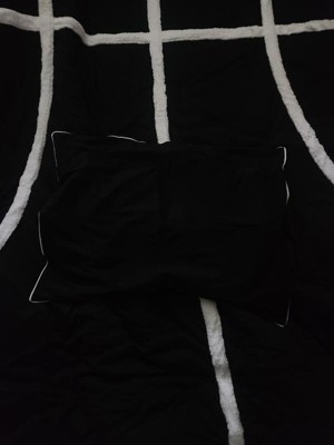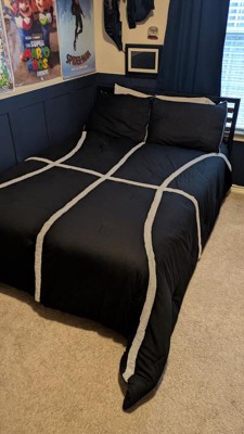 This was my family’s first experience with the Mingled Threads brand…and am happy to report that it was a very positive experience! Positives to share: Love the look! Absolutely love the white sportopia addition on the solid black background…gives the comforter a very special unique look. Unbelievably soft and comfortable…love the feel. Nice weight. Heavy enough for winter…but light enough for summer use. Love that this material does not wrinkle at all. Comes with two nicely made black pillow shams that have a touch of white around the edges. (Shams have ample closure material in the back to cover pillows nicely). The Full/Queen size bedding fits perfectly on my grandchild’s queen size pillowtop mattress. Washed nicely in cold water prior to use. Will be checking out other Mingled Threads bedding now that I have discovered the quality of the brand! Extremely pleased with this bedding!