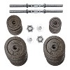 - 105-pound set includes (16) 5-pound, (4) 2.5-pound plates, (4) 1.25-pound plates, (2) 4-pound handles, and (4) 0.5-pound collars