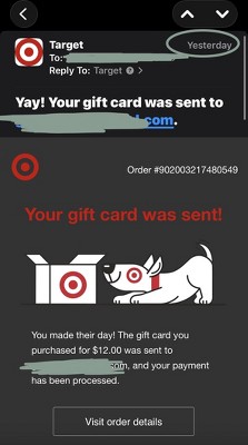 My recipient never received it and Target can't figure out which dept can help me resend it so they're out a Christmas gift and I'm out $36.00. Lesson learned, don't buy 3rd party gift cards at Target.