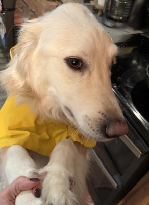 I received these products for free from the Hey, Bullseye™ sampling program in exchange for my honest review.” I loved this raincoat. It's super nice quality, with a rain repellent outer shell with reflective strip and super soft, silky interior this is worth the price. My dogs HATE water, go figure they're labs but they want nothing to do with getting wet. Since this was sent via the Hey, Bullseye™ , I had no idea about the sizing. I ordered the XL thinking my larger lab (80lbs) would be able to wear it, I was wrong, he would be a L size as he swam in the XL. I modeled on my daughter's dog (105lbs) and it fit just fine.