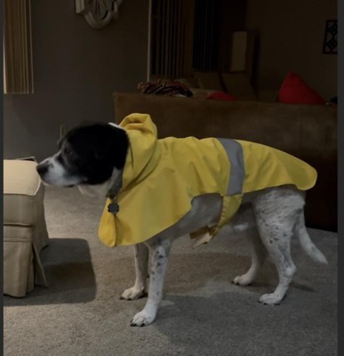 I received these products for free from the Hey, Bullseye™ sampling program in exchange for my honest review.” I loved this raincoat. It's super nice quality, with a rain repellent outer shell with reflective strip and super soft, silky interior this is worth the price. My dogs HATE water, go figure they're labs but they want nothing to do with getting wet. Since this was sent via the Hey, Bullseye™ , I had no idea about the sizing. I ordered the XL thinking my larger lab (80lbs) would be able to wear it, I was wrong, he would be a L size as he swam in the XL. I modeled on my daughter's dog (105lbs) and it fit just fine.