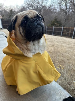 This raincoat is absolutely adorable. I just wish I would have ordered the correct size. The large was definitely too big for my 30 pound pug. I definitely will be looking for it in a smaller size for him.