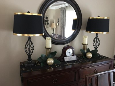 Get your glam on with a gorgeous topper for a stylish lamp. This hardback drum lamp shade by Springcrest Collection offers a bold black cotton fabric laminated on vinyl, and decorative metallic gold trim. Adding gleaming gold paper foil lining, it infuses a lush look in a bedroom or living area. The combination is stunning and elegant, adding a classic touch to modern or traditional lamps.