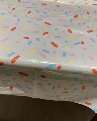 [This review was collected as part of a promotion.] This plastic tablecloth was perfect for an ice cream party I hosted. They confetti pattern look like sprinkles, and it was great for the toppings table. We were able to have a quick and easy cleanup with this disposable plastic tablecloth. It has bright colors in the confetti pattern which brightened up our table. The large rectangle size fit perfectly. I would recommend this cute tablecloth I received an incentive to write this review.