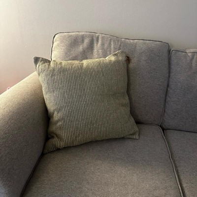 [This review was collected as part of a promotion.] This is a real nice chunky big couch or throw pillow. It has a big zipper on the side as shown so you can easily access that inner pillow in it. The color is very light in that next to our gray couch you can’t see that it’s super green and even under harsh light it’s not super green. It’s a very neutral green which I think is great! The back is also just a more plain pillow depending on your needs.
