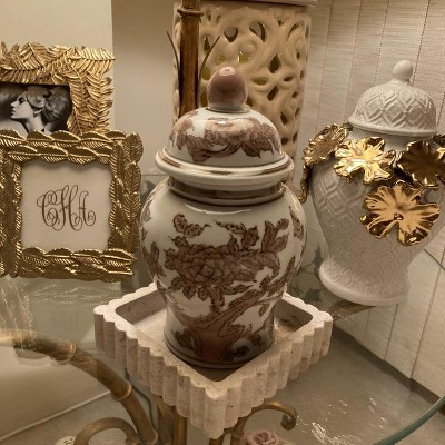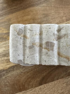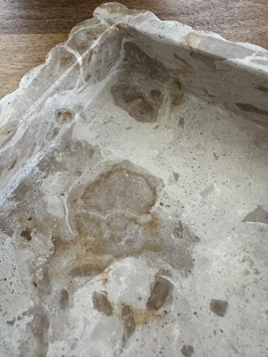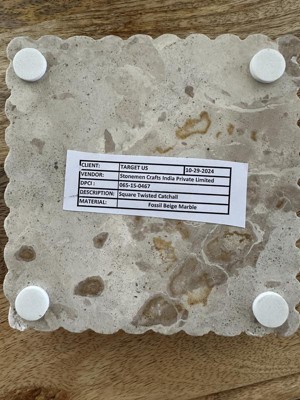 This little catchall is really nice. It's fairly heavy for it's size which is nice. Dimensions are approximately 5.5x5.5 and roughly 7/8" deep on the inside. As you can see it has nice ripples around the edges for an added designer touch. It's made of Fossil Beige Marble and is easy to clean by wiping with a damp towel. It also comes with nice little rubber feet to protect whatever counter you have this sitting on. I recommend this product for a simple yet stylish catchall or for just a little decoration.