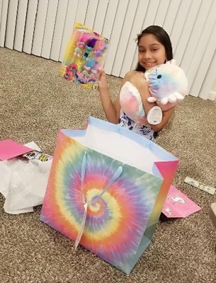 Make your gifts delightful inside-out with the Teen Girl Square Tie Dye Gift Bag - Spritz™. With a colorful spiral tie-dye pattern and a 'Happy Birthday' tag, this paper bag is a trendy way to present your gift. The blue ribbons as handles add a nice finishing touch and make the gift comfy to carry.