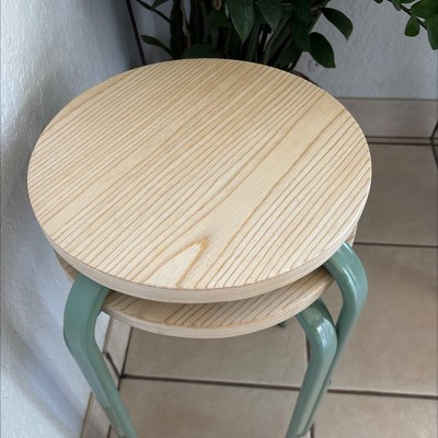 A: The stool features a round wood-finish seat with a contrasting steel frame for a stylish look.