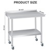 【Durable Stainless Steel Construction】:This workbench is meticulously crafted from 430 stainless steel (top frame) and a galvanized steel base frame. Its brushed finish ensures superior rust and corrosion resistance, and its smooth surface makes it quick and easy to clean, making it perfect for busy commercial kitchens, restaurants, or home use. 【360°Swiveling Casters and Backrest】: Equipped with four casters, the workbench rotates smoothly and quietly 360°, making it ideal for moving between work areas like the kitchen, garage, or workshop. Two casters with brakes lock the table in place, and the included backrest prevents items from accidentally falling, ensuring stability when preparing food, cooking, or working on uneven surfaces.【Multi-Space Versatility】:This workbench is designed for a variety of uses, suitable for commercial spaces (restaurants, hospitals, schools) and residential areas (kitchens, garages, patios). Use it as a food preparation table, a side table for grilling, a garage workbench, or a clothing organizer. Its durability is built to withstand years of daily, intensive use.【Adjustable Height and Base】:This stainless steel workbench features multiple adjustment holes on the uprights, allowing you to freely adjust the shelf height to accommodate items of varying heights. For example, to store taller vases or buckets, you can raise the shelves or remove the middle shelf, providing flexible storage options. 【Easy Assembly】: Clear instructions and labeled components make installation quick and easy, whether you're using this commercial stainless steel table in a dining room, garage, laundry room, or as a multi-purpose kitchen work surface at home.