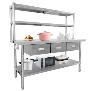 71" Stainless Steel Commercial Prep Table with Shelves & Drawers ¨C Adjustable Worktable for Kitchen, Garage & RestaurantProduct Description:Streamline your workspace with this versatile 71-inch stainless steel prep table, designed for both commercial and heavy-duty home use. Featuring a durable 0.6mm thickened stainless steel top, it supports up to 1460 pounds and includes two-tier removable overshelves for organized storage. Two smooth, silent drawers keep tools and utensils accessible, while the rust-proof, scratch-resistant surface ensures easy cleaning and long-term durability. Ideal for commercial kitchens, restaurants, garages, workshops, bars, and laundry rooms, this table combines professional functionality with a sleek, polished finish.Key Features:High Load-Bearing 1460 LBS CapacityConstructed with 0.6mm thickened stainless steel plate and reinforced tubes, this table supports up to 1460 pounds, providing a sturdy, reliable surface for food prep, workshop projects, or equipment storage.Two-Tier Removable OvershelvesFeatures double-layer removable shelves that offer ample storage space for supplies, tools, or ingredients. The removable design allows flexible access and customization to suit your workflow.Quiet, Smooth-Glide DrawersIncludes two stainless steel drawers that open and close silently and smoothly, helping to organize smaller items while maintaining a tidy, efficient workspace.Versatile Multi-Purpose DesignSuitable for commercial kitchens, restaurants, bars, garages, workshops, laundry rooms, schools, and hospitals. Functions as a prep table, workbench, serving station, or utility table.Easy Assembly & Low-Maintenance FinishComes with detailed instructions and all necessary hardware for straightforward setup. The rust-resistant, waterproof stainless steel surface wipes clean easily with a damp cloth, maintaining its polished appearance over time.Specifications:Dimensions: 71¡± L x 24¡± W x 65¡± HMaterial: 0.6mm Thickened Stainless SteelLoad Capacity: 1460 lbsShelves: Two-Tier Removable OvershelvesDrawers: 2 Smooth-Glide Silent DrawersFinish: Polished, Rust-ResistantAssembly: Required (Hardware & Manual Included)Use: Commercial Kitchen, Restaurant, Garage, Workshop, Bar, Laundry RoomWeight: 127.98 lbs