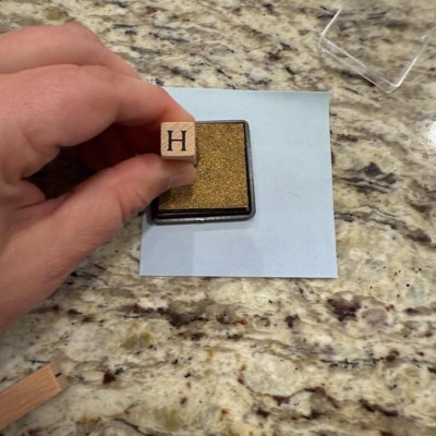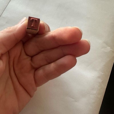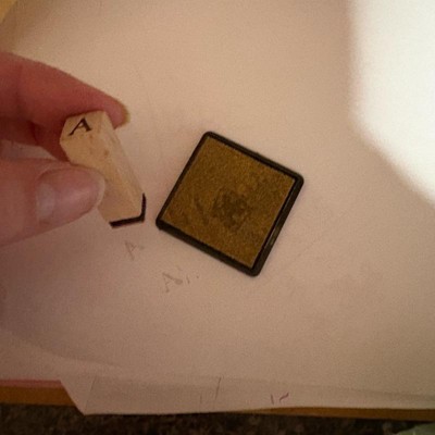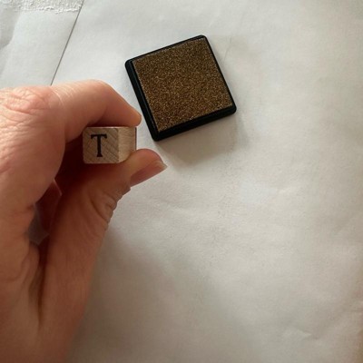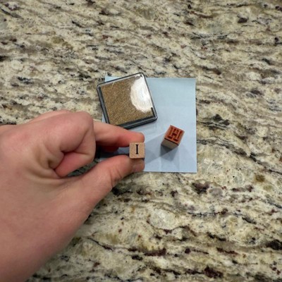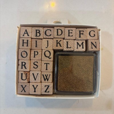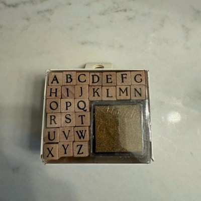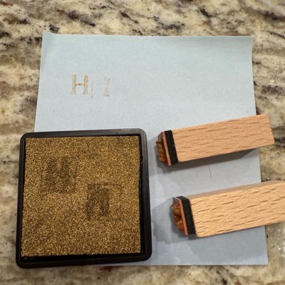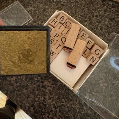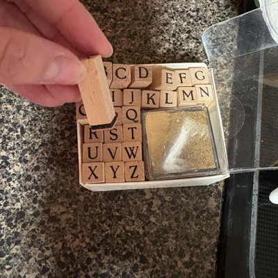 [This review was collected as part of a promotion.] This is a cute little stamp set that includes all the letters of the alphabet and a little gold stamp pad. I have shown my practice work as I got this specifically for stamping on holiday envelopes and gifts but you could use it for really any purpose. My daughter of course has taken to stamping her spelling words which has been a fun change up for her too!
