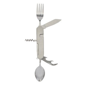 6 tool functionality: fork, spoon, knife, corkscrew, can opener and chisel