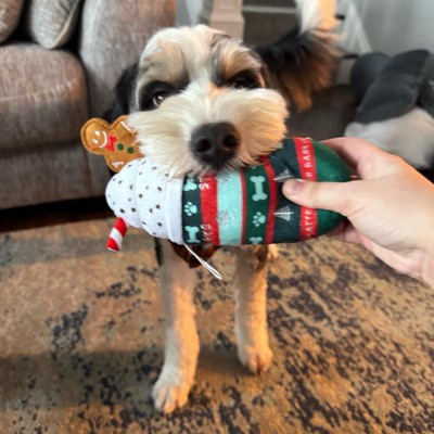 [This review was collected as part of a promotion.] My dog was very intrigued by this toy, and loved that she could chew both the soft part of the toy (green) and the tougher area of the gingerbread. This would make a great Christmas gift for any furry friend. However, the cup part of the toy is not extremely durable, so she easily broke into the stuffing within a few moments. However, fun was still had and I loved watching her enjoy this Christmas treat!