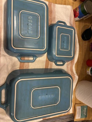 I love this Staub baking 3-piece set. The lovely light blue color is beautiful and adds a fresh, touch to my kitchen and table. Each piece has the perfect depth, making them ideal for everything from casseroles and roasted vegetables to desserts. The assorted length sizes are very practical. The quality looks and feels excellent.