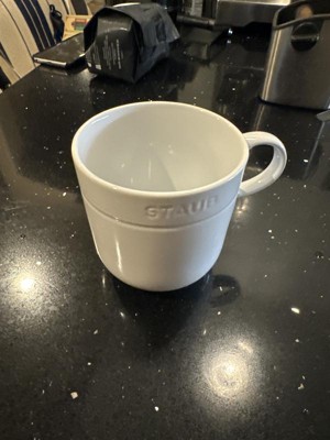I purchased the white truffle line to match my utensil holder. The cups are beautiful—not too heavy, but still quite stable to use. They’re a nice size (16 oz) for making coffee or tea. However, one of the mugs doesn’t have a very clear 'Staub' logo on the side; it’s almost not visible. I wish it were darker and thicker, like the other cups in the set.