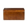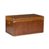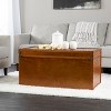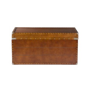 Revive your rustic decor with this trunk-inspired coffee table. A planked wood design and antique bronze nailheads highlight industrial style, while a lifting display top opens to reveal hidden storage space for everyday essentials. Station this trunk table in your living room to add a unique twist to your home decor, or place in your family den to cleverly tuck away blankets, board games, or toys. Conquer clutter in style when you bring home this rustic trunk storage table.T