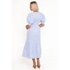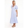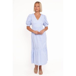 Turn heads in the Steele Puff Sleeve Midi Dress Blue Stripe print, a timeless blend of comfort and sophistication. This midi-length beauty is designed to flatter with its elegant V neckline and feminine A-line skirt.