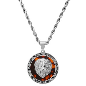 Steeltime 24" Men's stainless steel tortoise and simulated diamonds round Lion head pendant with greek key accents