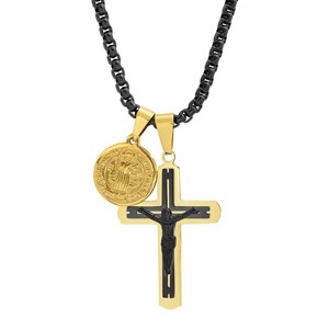 Men's two tone black ip & 18k gold plated stainless steel crucifix and round St. Benedict pendant. Thoughtfully designed for everyday wear and special moments, with a balanced profile that pairs easily with casual layers or evening looks. Each piece is produced with attention to proportion and comfort, emphasizing clean lines and subtle texture so it feels considered without being fussy. Wear it solo as a quiet statement or stack it with favorites to build a look that reflects your mood. Great as a gift or a personal update to your rotation; store in a soft pouch when not in use to help preserve the finish.
