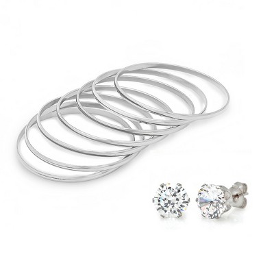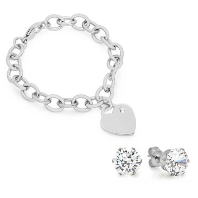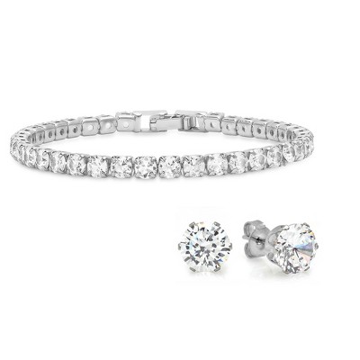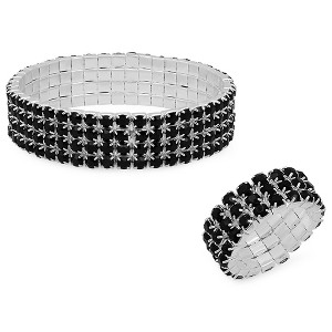 Steeltime Ladies sterling silver plated stretch bracelet and ring set with black simulated diamonds